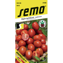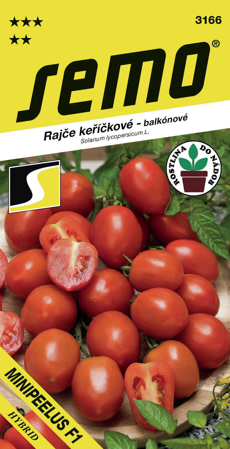MINIPEELUS F1SM (kód 3166) – kolekce do nádob – rané kompaktní keříčkové rajče s drobnými červenými oválnými plody (15–20 gramů). Vhodné i do menších nádob. Výška rostliny je 20–30 cm v závislosti na velikosti nádoby.