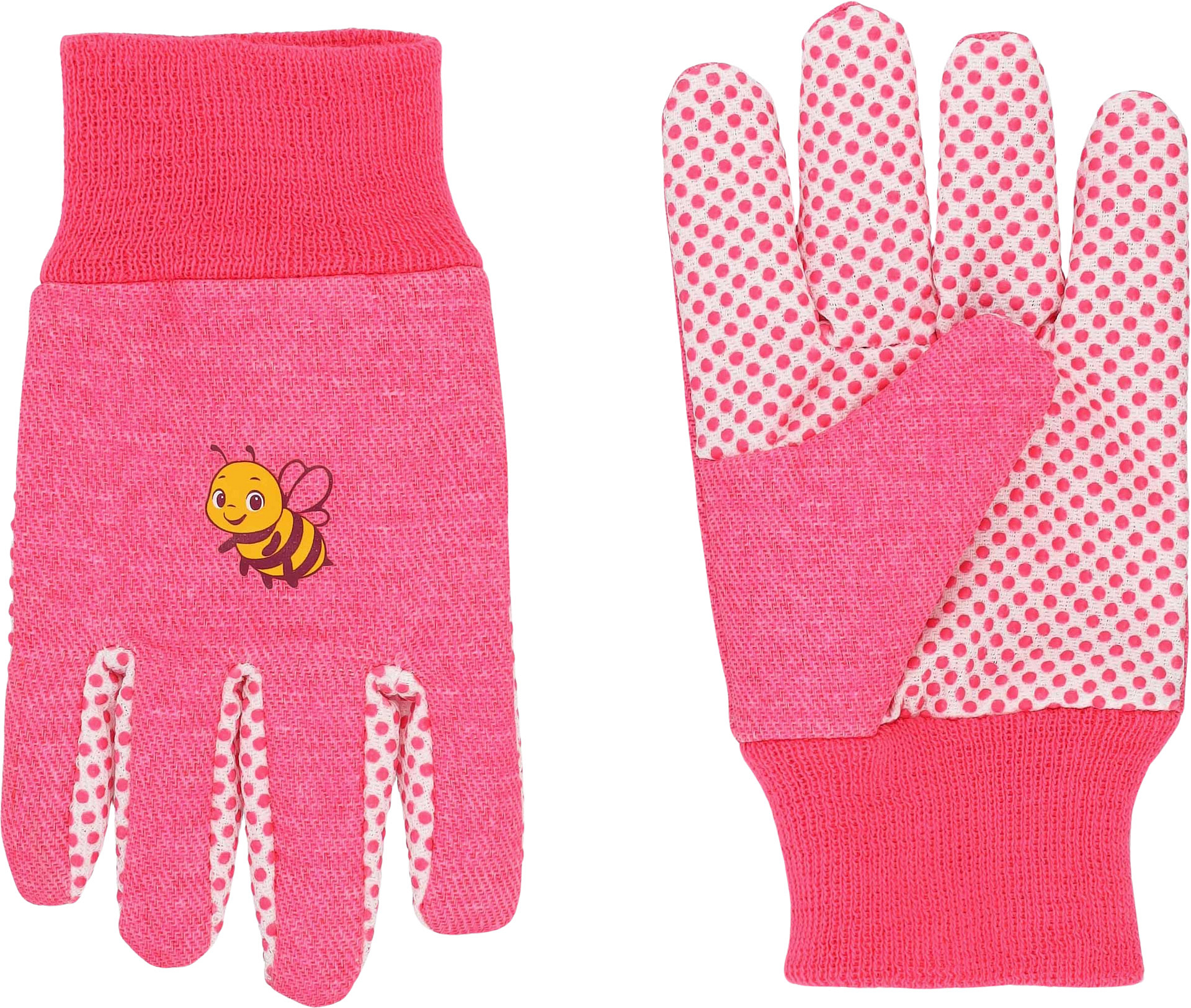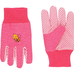 Dětské bavlněné pracovní rukavice, dlaňová strana a prsty s terčíky z PVC. Barva růžová s obrázkem.