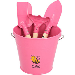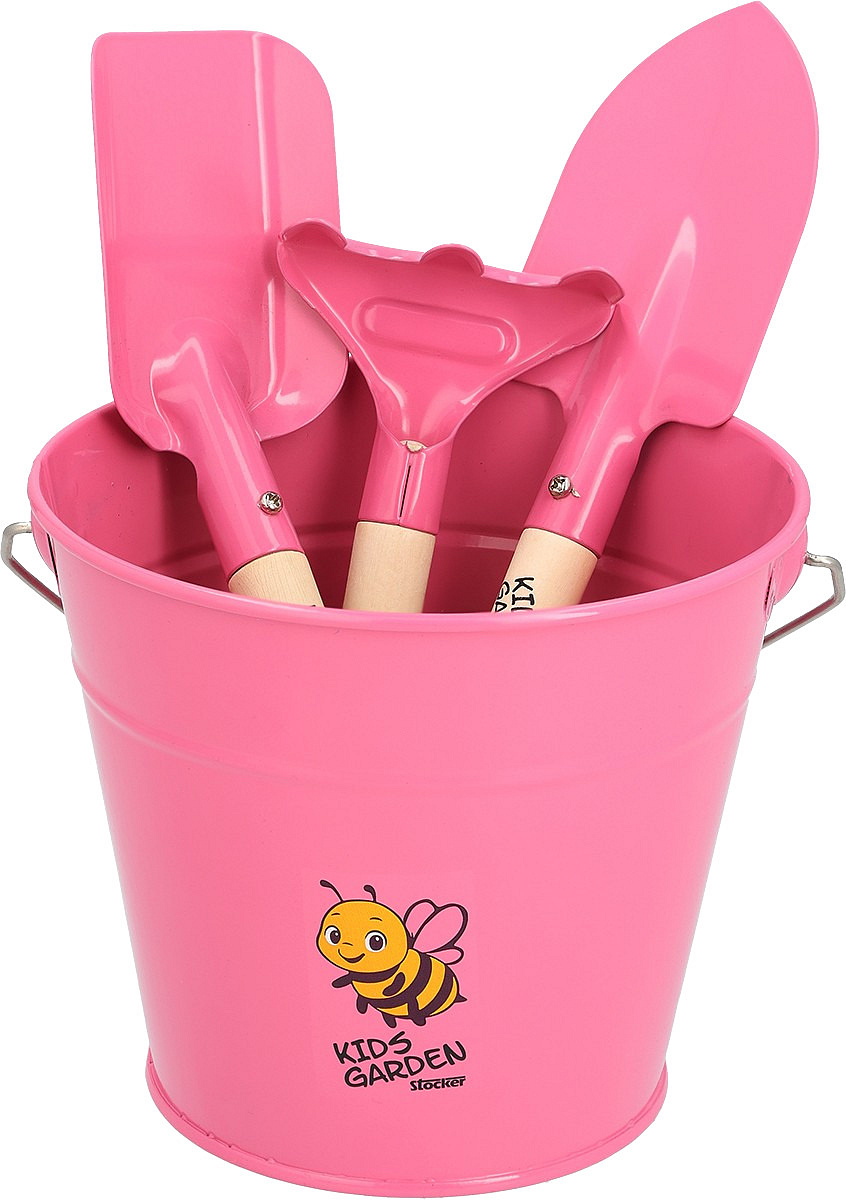 Sada dětského nářadí a kyblík v růžové barvě - hrabičky, lopatička a rýč s násadou s dětskými motivy.