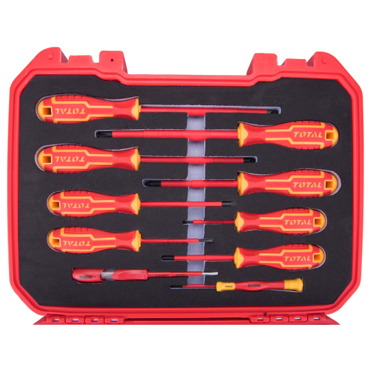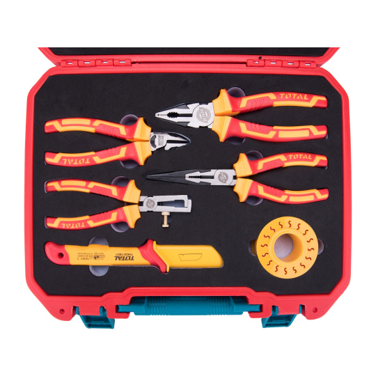Sada 16ks elektrikářského nářadí je vložena do červeného kufru z tvrzeného PVC. Všechny komponenty nářadí jsou držitely certifikací 1000V,VDE/GS. Nářadí je v kufru vloženo do výřezů z tvrdé pěny, který je specifický pro každý typ nářadí. Víte tedy přesně, kam po dokončení práce co uložit. V pěnové výplni je elegantně vyřešeno vyndávání nářadí. Pro šroubováky je uprostřed otvor pro prst a úchop přední strany šroubováku, pro kleště je po stranách otvor pro palec a ukazováček. Sada obsahuje tyto druhy nářadí: 1ks 200mm elektrikářské kombinované kleště, 1ks 200mm elektrikářské přímé kleště, 1ks 160mm elektrikářské boční štípací kleště, 1ks 160mm elektrikářské kleště na odizolování kabelů, 4ks elektrikářské šroubováky přímé SL3x75mm, SL4.0x100mm;,SL5.5x125mm, SL6.5x150mm, 5ks elektrikářských šroubováků křížových PH00x50mm, PH0x60mm, PH1x80mm, PH2x100mm, PH3x150mm, 1ks 30x70mm zkoušečky napětí, 1ks 50x180mm nůž na kabely, 1ks elektrikářské vinylové pásky Baleno v kufru