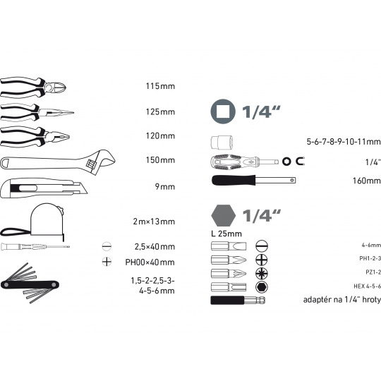 1/4"(L25mm): (-)4-6mm, PH1-2-3, PZ1-2, H4-5-6mm (CrV)