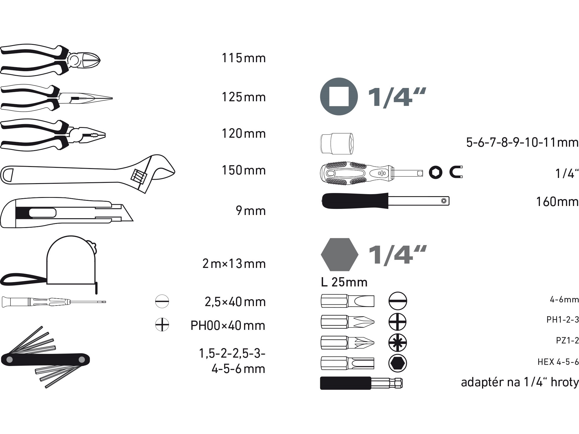 1/4"(L25mm): (-)4-6mm, PH1-2-3, PZ1-2, H4-5-6mm (CrV)