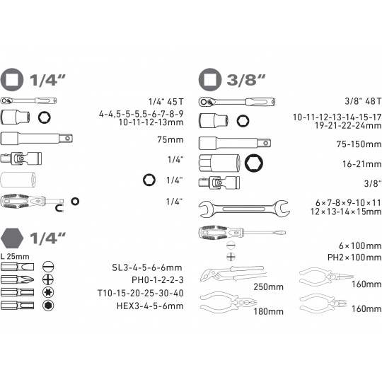 1/4": 4-4,5-5-5,5-6-7-8-9-10-11-12-13mm, 3/8": 10,11,12,13,14,15,17,19,21,22,24mm (CrV)