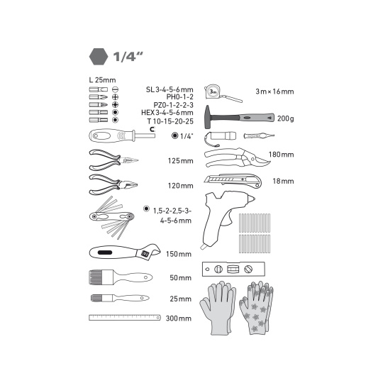 štětce ploché šířka 25 a 50mm, ocelové pravítko 300mm, vodováha 170mm, svítilna LED 60lm, pinzeta s LED světlem, pistole tavná pr.7,2mm 25W, tyčinky tavné pr. 7,2mm 12ks-mix barev a 12ks-transparentní