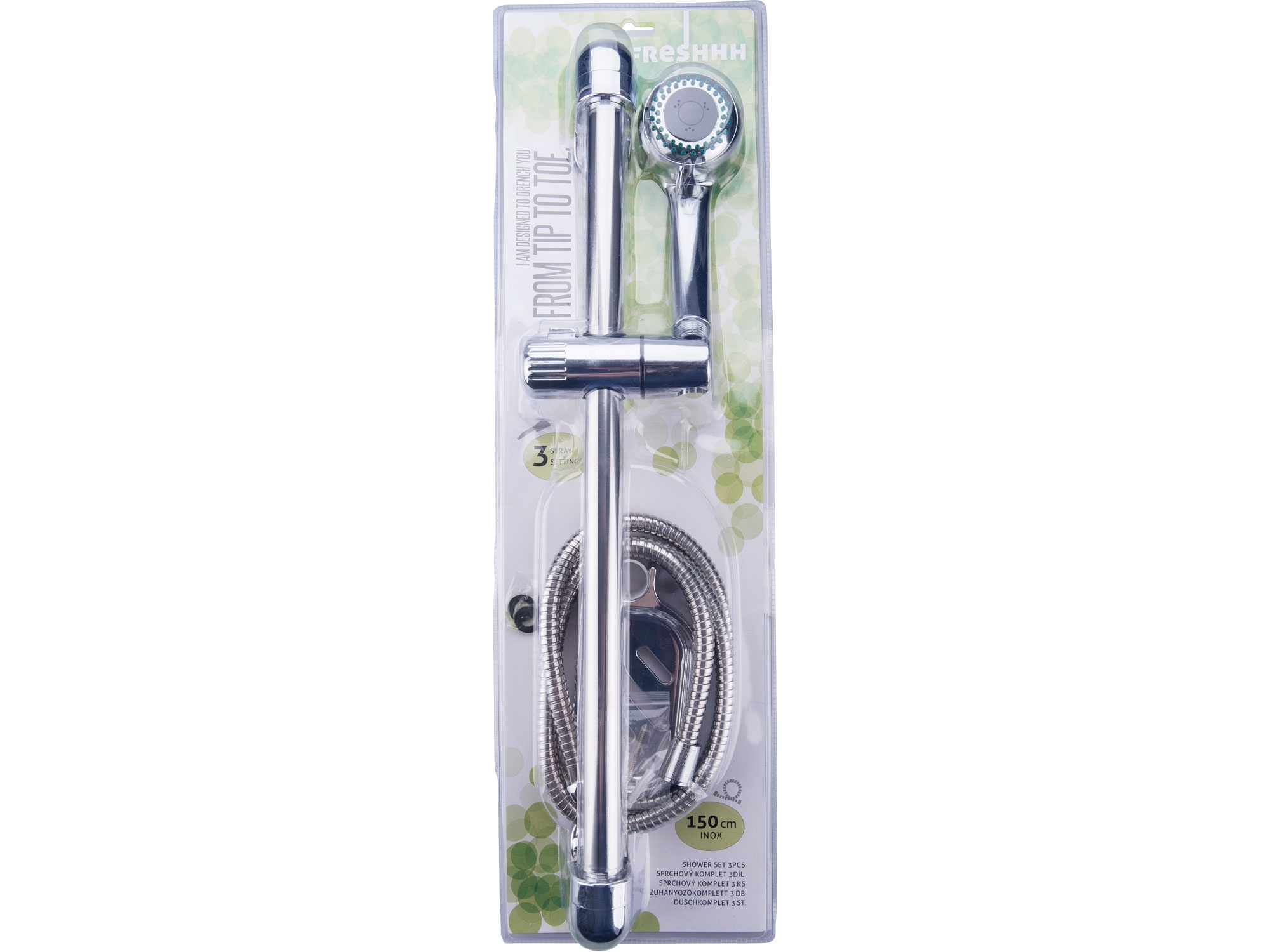 3funkční hlavice, držák na sprchu, hadice 150cm, držák na mýdlo, tyč 54cm