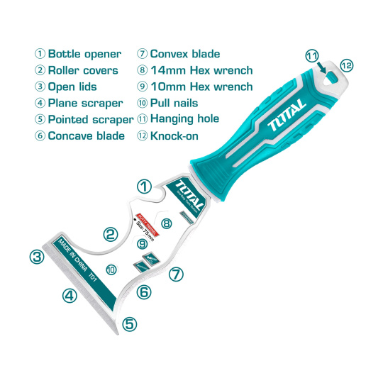 Velikost 75mm (3'')Tloušťka: 1,8 mmTepelně tvrzenoJemně leštěnoFunkce:Č. 1 Čištění krytu válečkuČ.2 Plochá škrabkaČ.3 Bajonetová škrabkaČ.4 DauberČ.5 ŤukČ.6 Konvexní škrabkaČ.7 Konkávní škrabkaČ.8 Malý šestihranný šroubovákČ.9 Velký šestihranný šroubovákČ.10 Odstraňovač sponekČ.11 Otvírák na láhveČ.12 Otvor pro zavěšeníIndustriální kvalita.