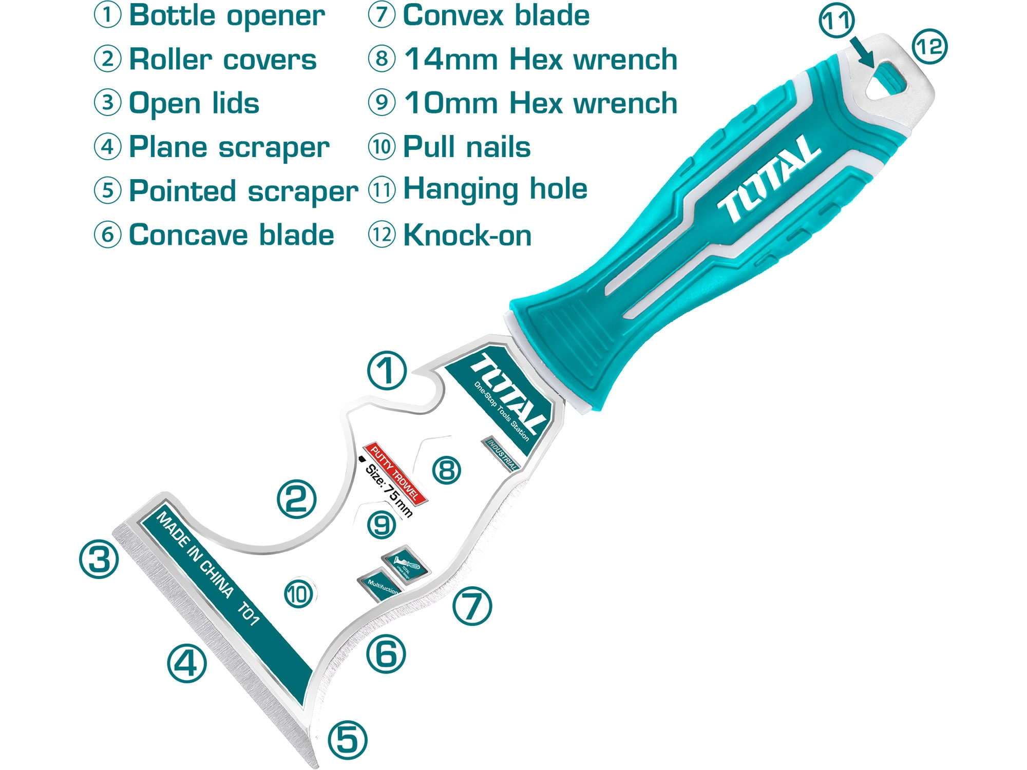 Velikost 75mm (3'')Tloušťka: 1,8 mmTepelně tvrzenoJemně leštěnoFunkce:Č. 1 Čištění krytu válečkuČ.2 Plochá škrabkaČ.3 Bajonetová škrabkaČ.4 DauberČ.5 ŤukČ.6 Konvexní škrabkaČ.7 Konkávní škrabkaČ.8 Malý šestihranný šroubovákČ.9 Velký šestihranný šroubovákČ.10 Odstraňovač sponekČ.11 Otvírák na láhveČ.12 Otvor pro zavěšeníIndustriální kvalita.