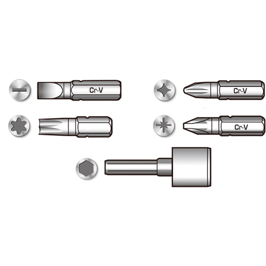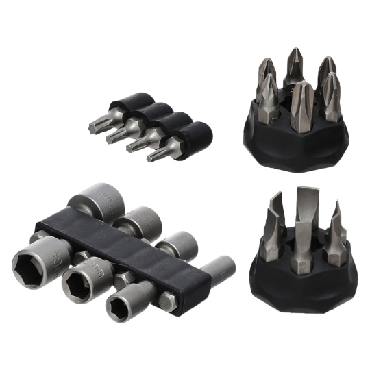 16ks 6.35x25mm hrotů: SL3,SL4,SL5,SL6,SL6,SL7,PH1,PH2,PH2,PH3,PZ1,PZ2,T10,T15,T20,T25, 7ks 1/4" zástrčných hlavic: 5,6,7,8,9,10,11mm , 1ks ráčnového šroubováku