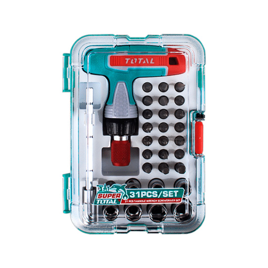 Velmi hezký sada ráčnového šroubováku s T-rukojetí pro běžnou práci. Obsahuje 31 hrotů a nástavců. Baleno v designové krabičce TOTAL.