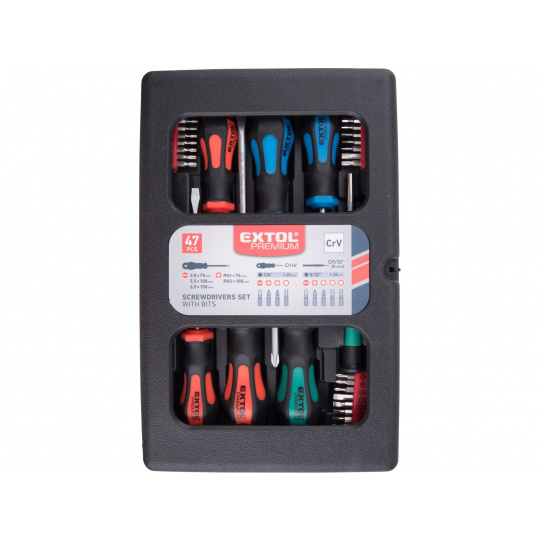 (-):3,5x75mm, 5,5x100, 6,5x150, PH: 1x75mm, 2x100, šroubovák na 1/4", hroty 1/4" : (-) 4-5-6mm,PH 1-2, PZ 1-2, T 10-15-20, šroubovák na 4mm mini-hroty: (-) 1-1,5-2-2,5-3-3,5-4mm, PH: 000-00-0-1, PZ: 0-1, T 4-5-6-7-8-9-10-15-20, HEX 0,7-0,9-1,3-1,5-2-2,5-3-4mm