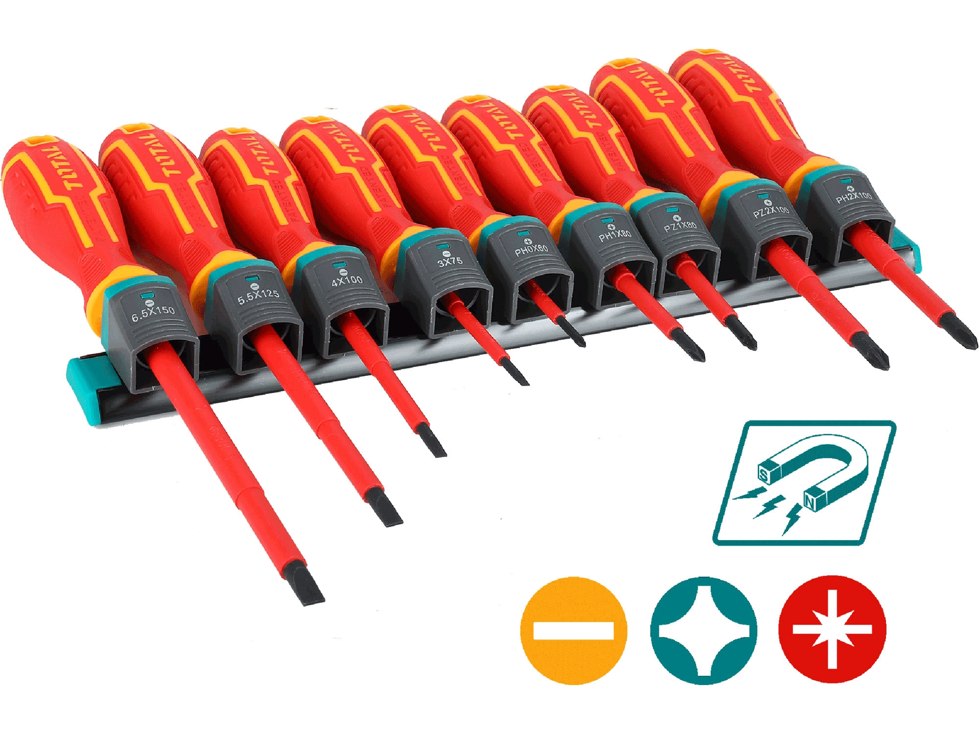 Sada elektrikářských šroubováků upevnitelná na zeď. Dodáváno s hmoždinkami a šroubky pro připevnění na zeď.Šroubováky mají výrazný červený design typický pro všechna elektrikářská nářadí firmy Total tools. Provedení šrobováků je v industriální kvalitě. Jsou tedy vhodné jak pro řemeslníky, tak pro firmy. Šroubováky jsou magnetické. Sada obsahuje tyto šroubováky 9ks: SL3.0x75, SL4.0x100, SL5.5x125, SL6.5x150, PH0x60, PH1x80, PH2x100, PZ1x80, PZ2x100, Šroubováky v sadě mají nový design rukojetí. Jsou certifikovány 1000V,VDE+GS Certifikací.
