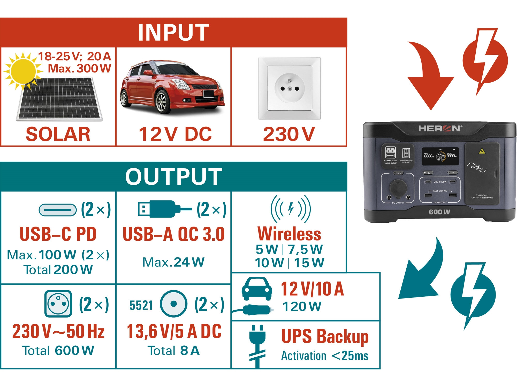 1× autozásuvka 12V/10A (120W), 2× DC 5521 13,6V/5A, celkem max. 8A