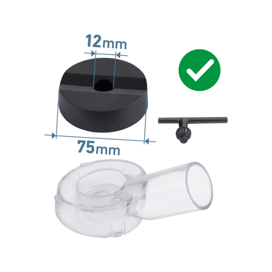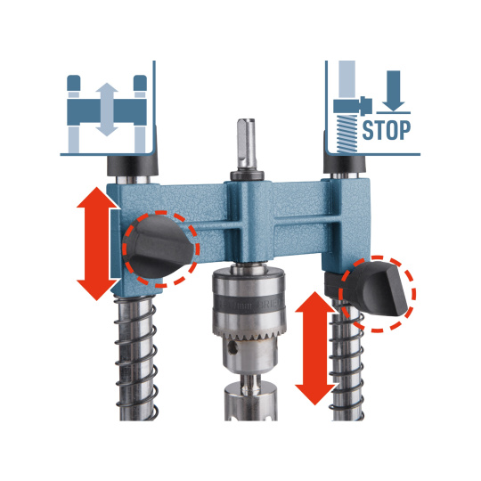 max výška mezi sklíčidlem a spodní části základny je 188mm a max. průměr vrtání (při použití korunek) je 75mm, což je průměr otvoru v základně