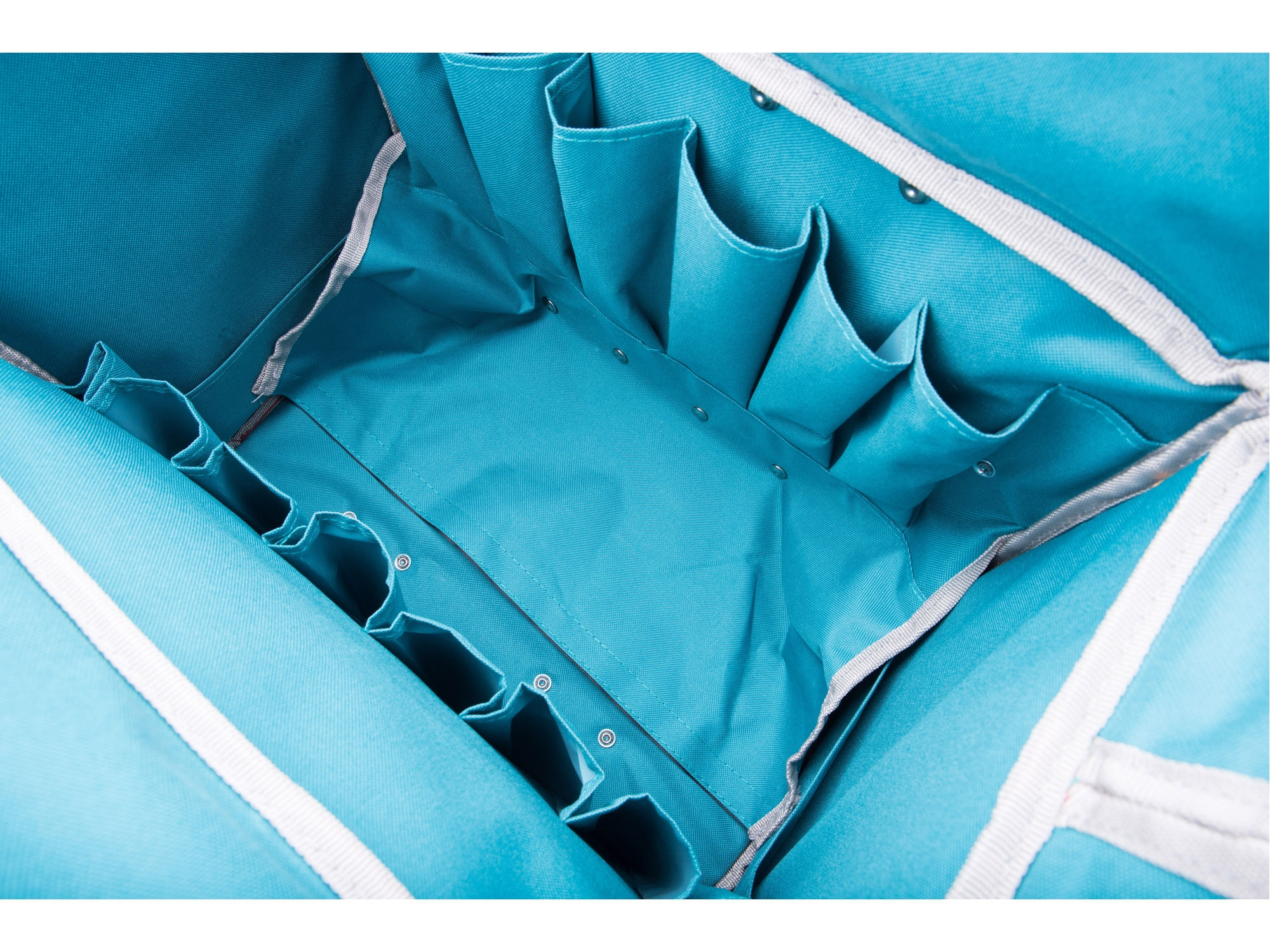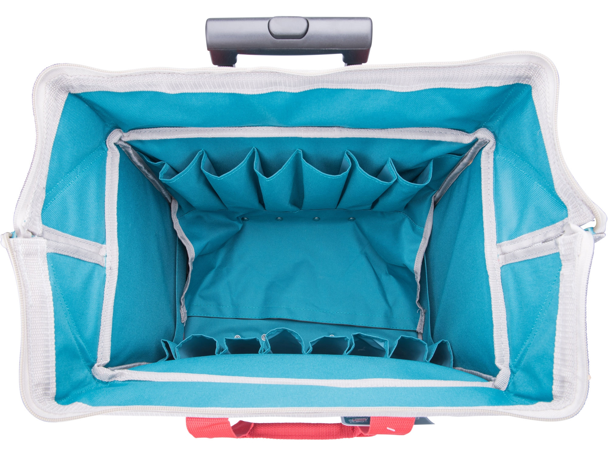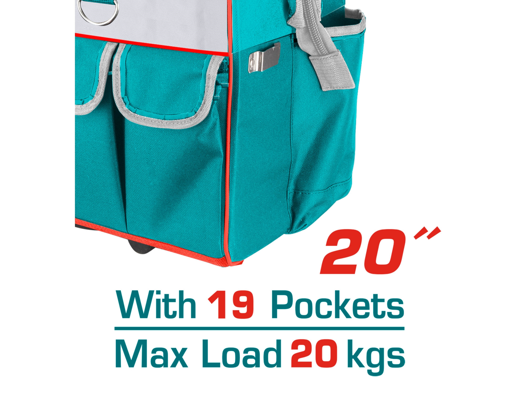 Taška na nářadí s šířkou 45cm. Taška je vybavena pojezdovými kolečky s polohovatelnou rukojetí. Vevnitř tašky je velký úložný prostor pro nářadí. Po stranách úložného prostoru je na jedné straně 7 a na druhé straně 6 kapes pro nářadí jako kleště, šroubováky atd.. Hlavní úložný prostor se otevírá nahoru po dvou stranách, což umožňuje lepší využití vnitřního prostoru. Uzavíratelné na zip. Na vnější čelní straně tašky jsou dvě menší a jedna větší kapsa na suchý zip. Z boku tašky jsou rovněž kapsy pro možné uskladnění nářadí. Taška je vybavena uchy pro pohodlné nošení. Materiál: 600D a 1680D polyester a materiál proti vlhkosti na stranách. Maximální nosnost 20kg, s kolečky a teleskopickou výsuvnou rukojetí. Délka, šířka, výška: 45x28x36cm. Pevný rám pro snadné otevírání a přístup.
