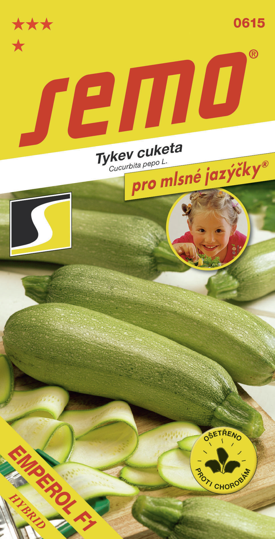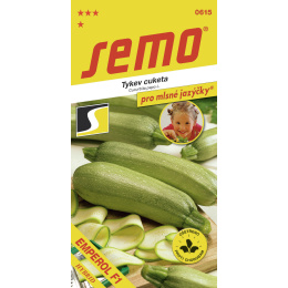 EMPEROL F1 SM (kód 0615) - kolekce PRO MLSNÉ JAZÝČKY - rovnoměrně plodící cuketa s kratšími (15-20 cm) válcovitými, tupě zakončenými plody bělozelené barvy s jemnou síťovanou slupkou. Je raná, velmi výnosná a určená zejména pro sklizeň mladých lahůdkových „baby“ plodů, které jsou velice jemné, zvláště vhodné na grilování a pečení.