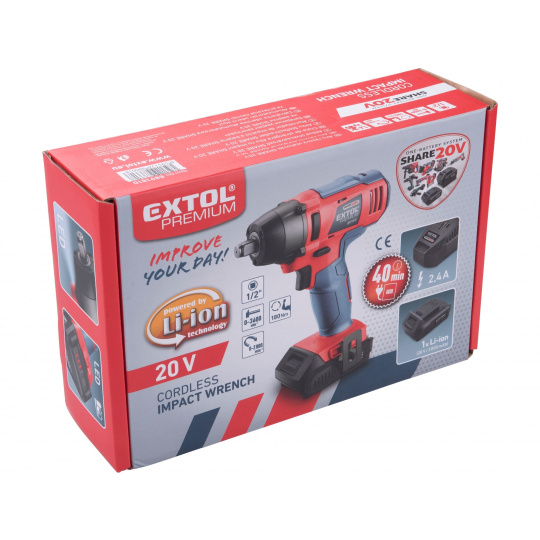 Lehký a výkonný rázový aku utahovák s max. kroutícím momentem 180Nm Vám poskytuje výkon, který potřebujete k dokončení široké škály utahovacích operací – utahování a povolování šroubů. Rázový moment zvyšuje sílu utahováku při šroubování a zároveň snižuje spotřebu baterie. Proto je při šroubování mnohem efektivnější než aku vrtačka a také zašroubuje více šroubů na jedno nabití baterie. Celokovová převodovka zajišťuje bezchybný chod při i vysoké zátěži a přispívá k lepšímu odvodu tepla vznikajícího při práci. Pro běžnou práci dostačují jeden nebo dva 2000mAh akumulátory, které můžete rychle nabít v rychlonabíječce, pro náročnější nebo delší práci doporučujeme větší akumulátory s kapacitou 4000–8000mAh. Akumulátor lze použít ve všech typech nářadí řady EXTOL SHARE20V. Díky použité Li-ion technologii je ho možné kdykoliv dobíjet, aniž by se tím snižovala jeho kapacita. Li-ion akumulátor ztrácí energii vlivem samovybíjení velmi pomalu a vydrží dlouho nabitý a připravený k použití.