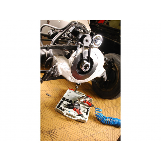 nástrčné hlavice 9-10-11-13-14-17-19-22-24-27mm, nástavec 125mm, imbusový klíč 4mm, olejnička, konektor pro rychlospojku, přepravní kufr