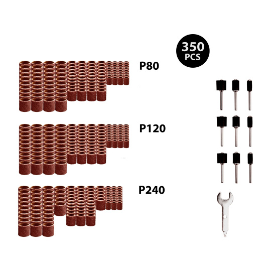 brusné válce: P80 120×, P120 120×, P240 100×, ⌀9-12-14mm × 13mm, unašeč 9×: ⌀6,4-9,5-12,7mm, stopka ⌀3,2mm, plastová krabička s rozdělovači