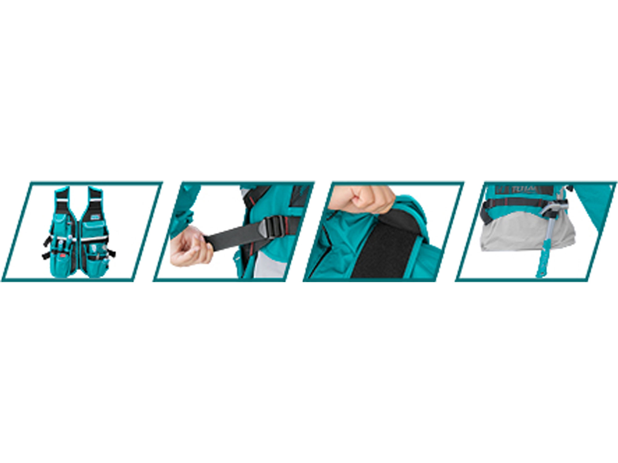 rozměr 42x60x3cm, maximální zátěž 3kg, vzducho propustný materiál, 12 kapes a 1 držák na kladivo, nastavitelné popruhy dle velilkosti postavy