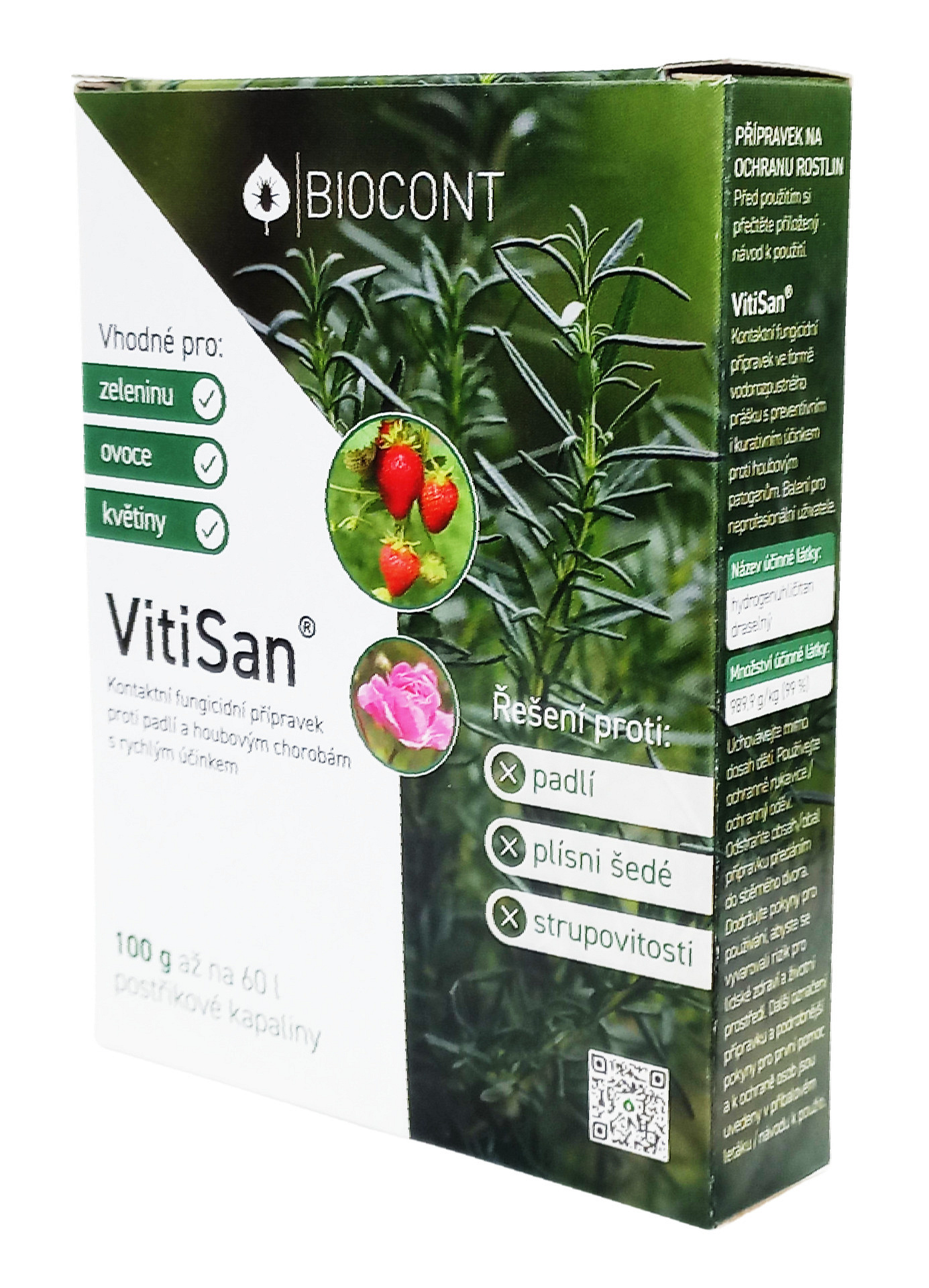 VitiSan je kontaktní biologický fungicidní přípravek proti padlí a plísni šedé u révy vinné, padlí a strupovitosti u jádrového ovoce a padlí na zelenině.