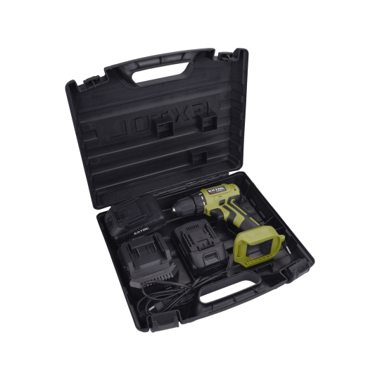Lehký a výkonný dvourychlostní vrtací aku šroubovák s příklepem Vám poskytuje vysoký vrtací výkon při vrtání do široké škály materiálů – ocel, kovy, dřevo, plast. Díky svému příjemnému designu se s ním velmi dobře pracuje. Vrtačka je poháněná nejmodernějším „brushless" motorem. Tento nový typ motoru má vyšší životnost, je výkonnější a má menší spotřebu el. energie než klasické motory s uhlíkovými kartáči. Dvourychlostní převodovka umožňuje nastavit odpovídající otáčky pro konkrétní druh práce. Vrtáky se upínají do kvalitního sklíčidla s aretací. Vrtačka má 2 režimy práce: vrtání a šroubování. Pro šroubování si můžete vybrat jeden z přednastavených 20stupňů momentů. Integrovaná LED svítilna osvětluje pracovní prostor a pro zlepšení orientace v tmavých prostorech má zpožděné vypnutí. Rukojeť je pokryta gumou, která snižuje přenos vibrací do ruky a spolu s nízkou hmotností, ergonomickým tvarem a vyvážením činí práci příjemnější a méně únavnou. Díky použité Li-ion technologii je ho možné kdykoliv dobíjet, aniž by se tím snižovala jeho kapacita. Li-ion akumulátor ztrácí energii vlivem samovybíjení velmi pomalu a vydrží dlouho nabitý a připravený k použití.