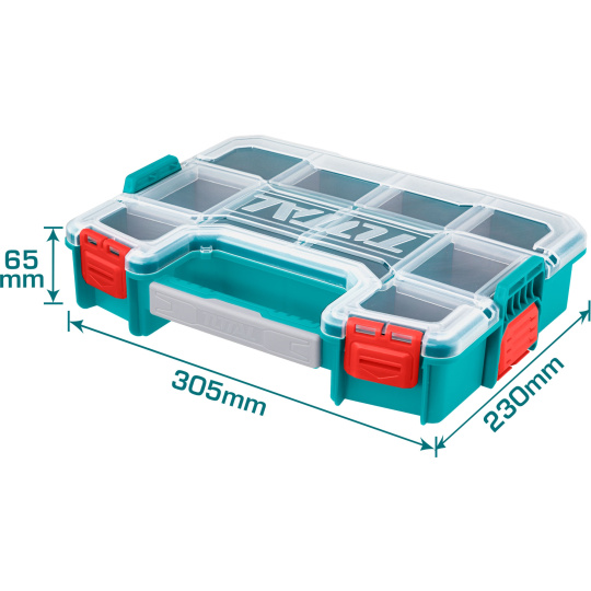 Plastový organizér, Velikost: 305 mmx230 mmx65 mm, Lze skládat dohromadyMateriál: PP, Odnímatelné přepážky, Baleno v kartonové krabici.