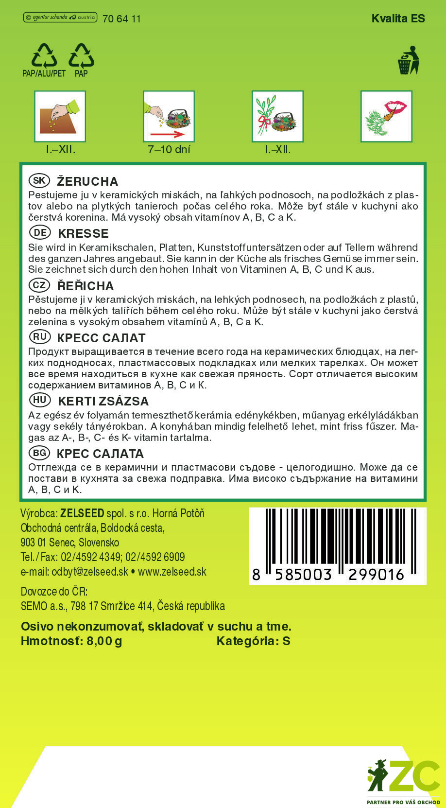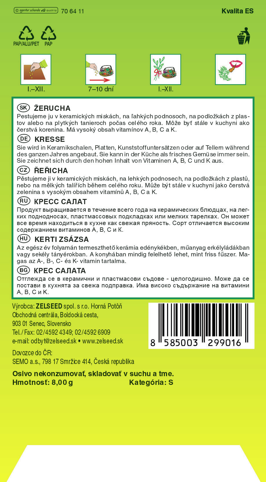 Jemná listová zelenina vhodná hlavně k rychlení v zimním a předjarním období. Sklízíme mladé rostlinky vysoké 4 – 6 cm. Vyséváme nahusto do truhlíků, misek či jiných pěstebních nádob. Sejeme na povrch substrátu a nezasypáváme. Výborným pěstebním substrátem je buničitá vata. Udržujeme přiměřenou vlhkost a teplotu 15 – 18oC. Nehnojíme. Sklízíme 7 – 14 dní od výsevu odřezáváním celých rostlin těsně nad povrchem substrátu. Z 1 m2 pěstební plochy získáme 0,3 – 0,4 kg zelené hmoty.
