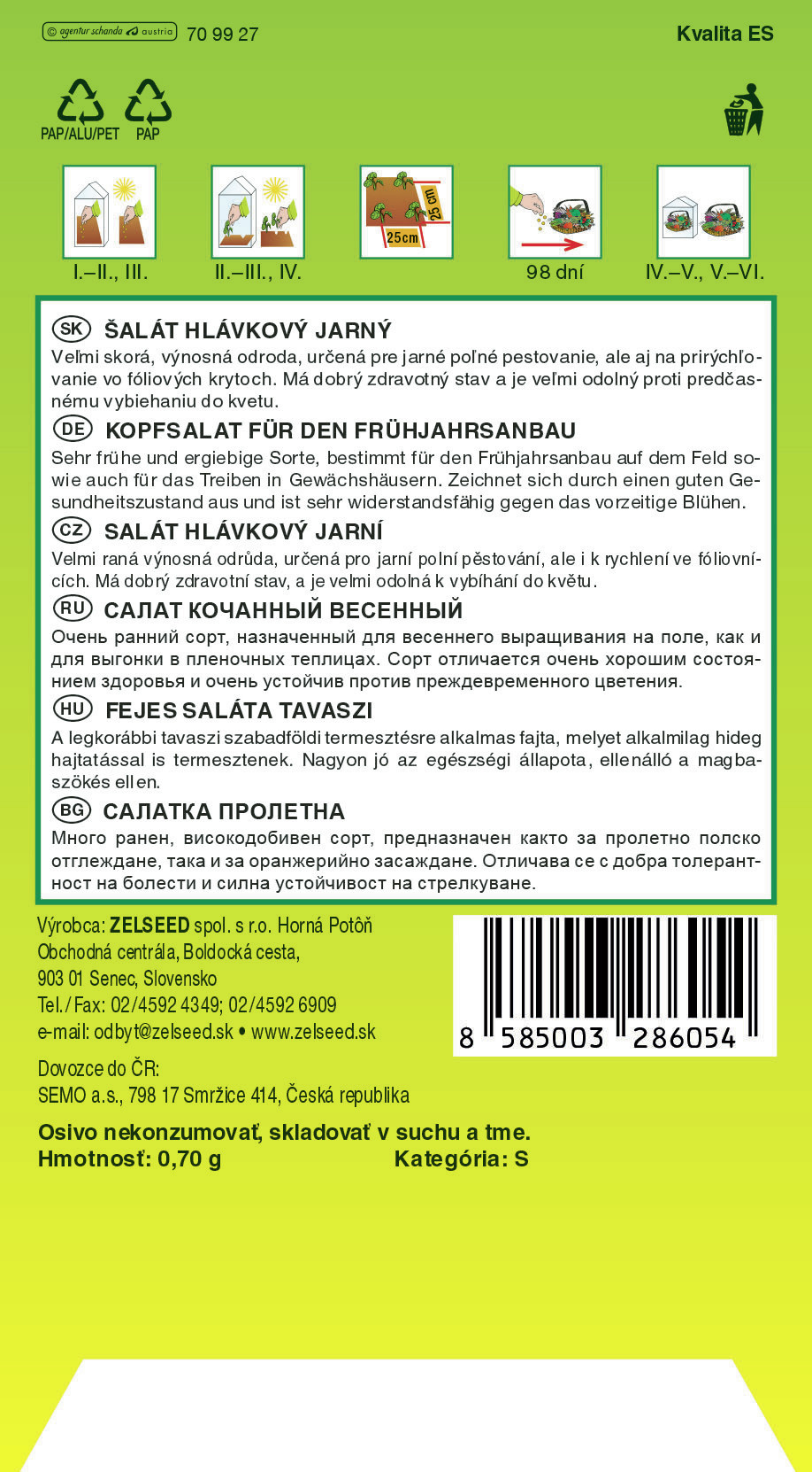 Velmi raná výnosná odrůda, určená pro jarní polní pěstování, ale i k rychlení ve fóliovnících. Salát hlávkový / Lactuca sativa L. var. capitata L.Popis:Salát vyžaduje dobrou, dostatečně vzdušnou půdu v II. trati. Je náročný na zásobení živinami v okamžitě přijatelné formě. Doporučujeme osluněné polohy. Při výsevu přím... viac