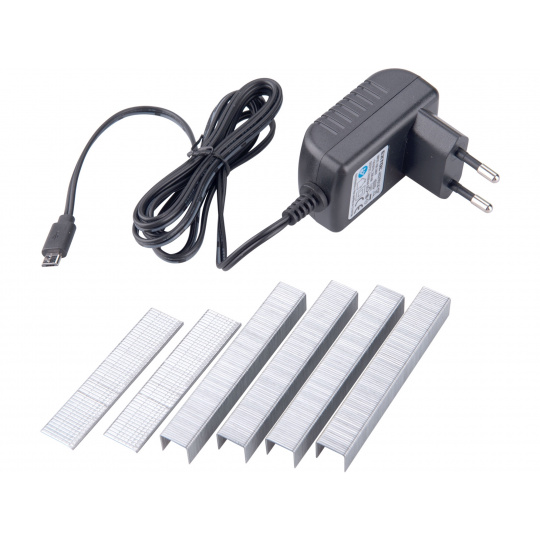 Velmi praktická akumulátorová sponkovačka/hřebíkovačka s adaptérem pro sešívání papíru je určena k připevňování textilií, fólií, plachet, igelitu, kůže, lepenky, dekoračních a izolačních materiálů apod. na dřevěný podklad nebo dřevu podobný materiál pomocí spon a hřebíků. Díky novému USB konektoru je možné sponkovačku nabíjet z běžné USB nabíječky, počítače nebo powerbanky a díky tomu lze neomezeně používat i v místech kde není proud. Li-ion akumulátor umožňuje aku brusku kdykoliv dobíjet, aniž by se tím snižovala kapacita akumulátoru. Li-ion akumulátor ztrácí energii vlivem samovybíjení velmi pomalu a vydrží dlouho nabitý.