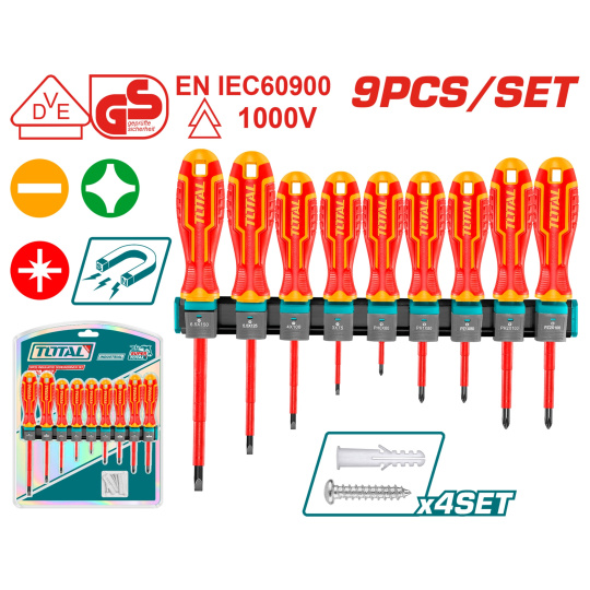 Sada elektrikářských šroubováků upevnitelná na zeď. Dodáváno s hmoždinkami a šroubky pro připevnění na zeď.Šroubováky mají výrazný červený design typický pro všechna elektrikářská nářadí firmy Total tools. Provedení šrobováků je v industriální kvalitě. Jsou tedy vhodné jak pro řemeslníky, tak pro firmy. Šroubováky jsou magnetické. Sada obsahuje tyto šroubováky 9ks: SL3.0x75, SL4.0x100, SL5.5x125, SL6.5x150, PH0x60, PH1x80, PH2x100, PZ1x80, PZ2x100, Šroubováky v sadě mají nový design rukojetí. Jsou certifikovány 1000V,VDE+GS Certifikací.