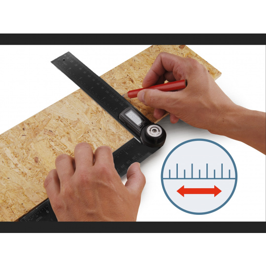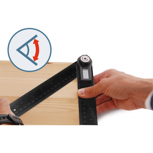 s pravítkem, rozsah měření 0°-360°, přesnost ±0,3°, rozlišení 0,1°, pravítko 400mmx35mm, LCD displej, baterie 3V typ CR2032, možnost zajištění v určitém úhlu, použití k měření úhlů nebo jako pravítko