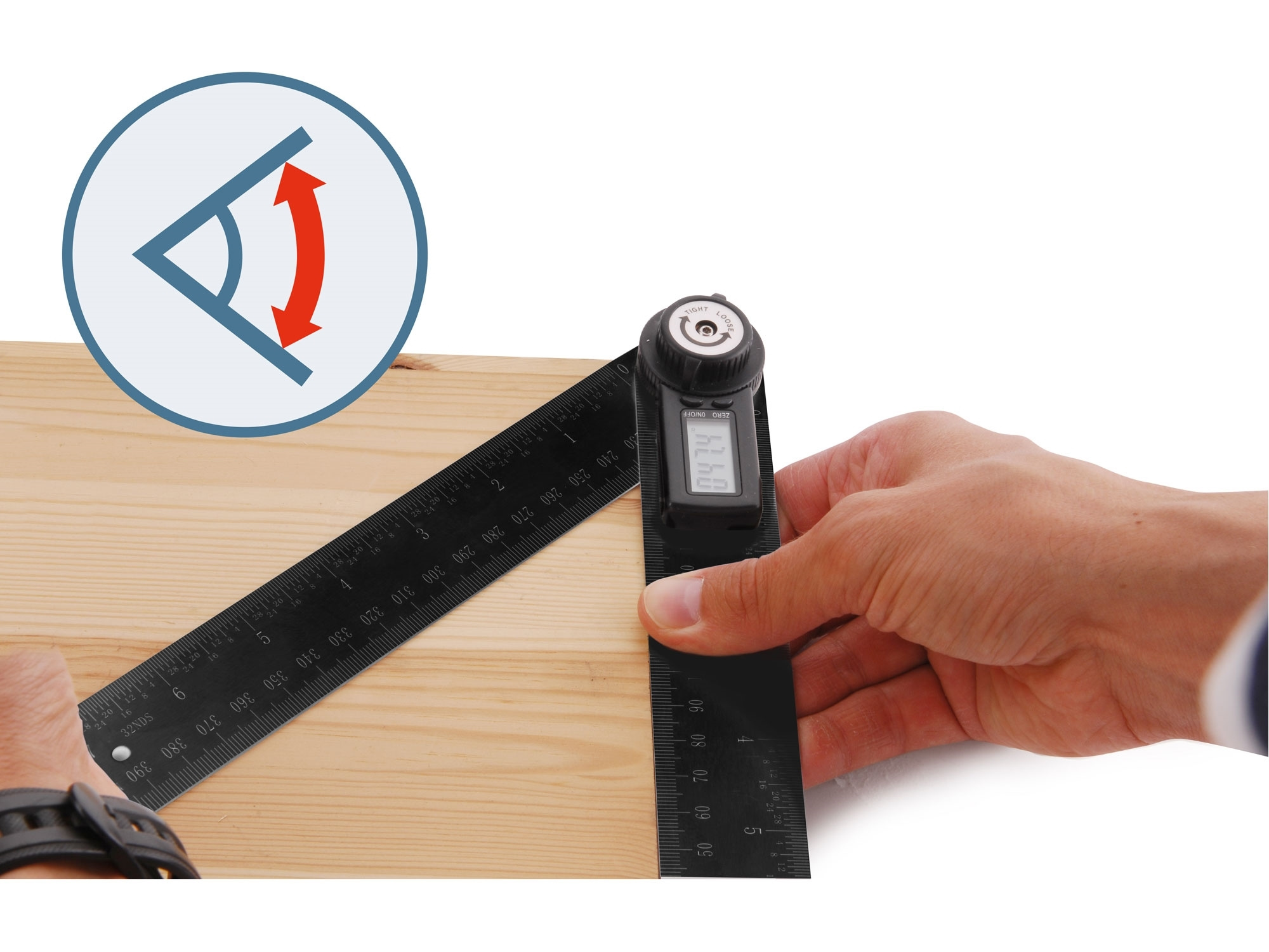 s pravítkem, rozsah měření 0°-360°, přesnost ±0,3°, rozlišení 0,1°, pravítko 400mmx35mm, LCD displej, baterie 3V typ CR2032, možnost zajištění v určitém úhlu, použití k měření úhlů nebo jako pravítko