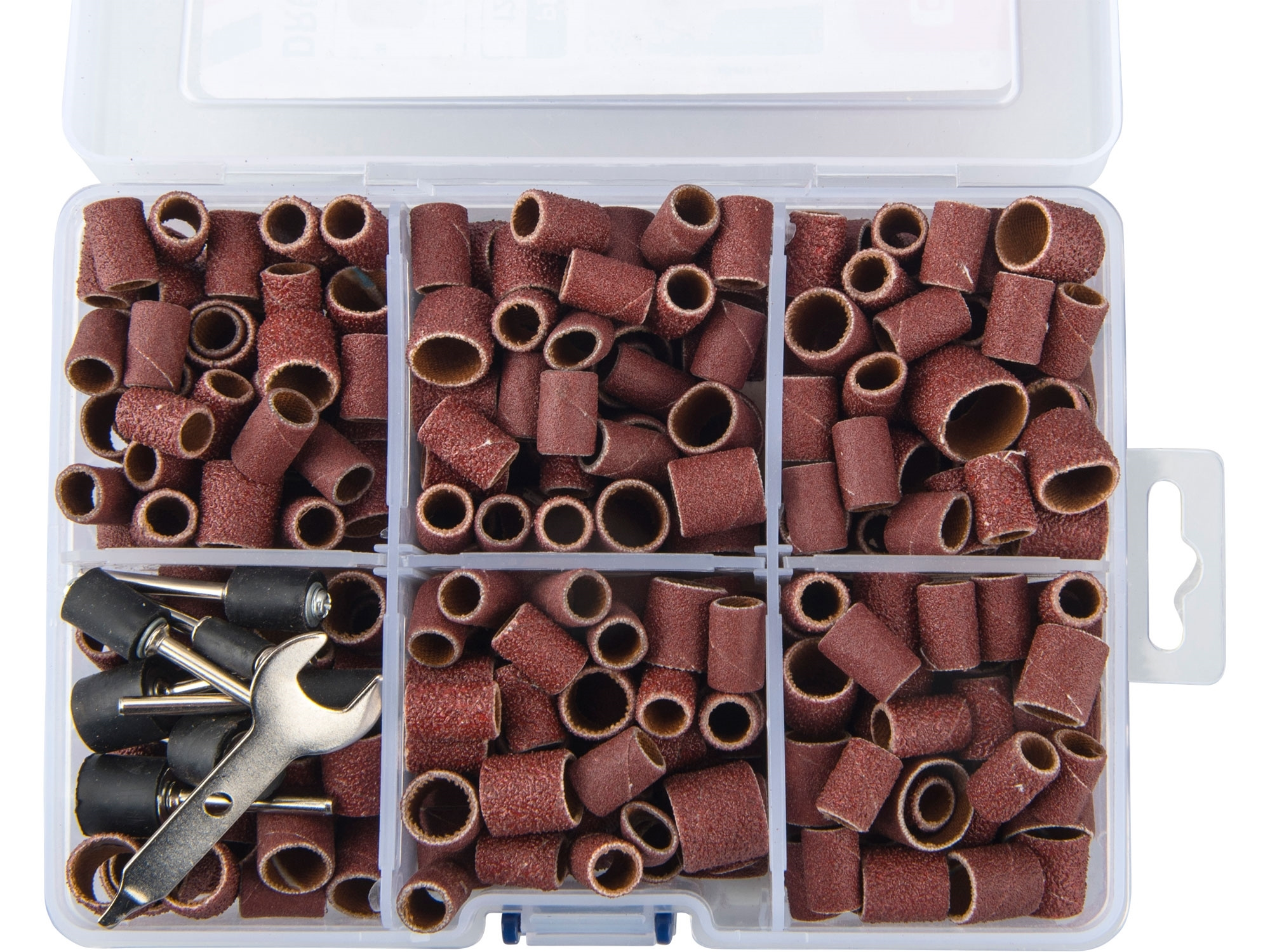 brusné válce: P80 120×, P120 120×, P240 100×, ⌀9-12-14mm × 13mm, unašeč 9×: ⌀6,4-9,5-12,7mm, stopka ⌀3,2mm, plastová krabička s rozdělovači