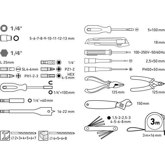 25mm: (-)4-6mm, PH1-2-3, PZ1-2, HEX 4-5mm, adapter 1/4”