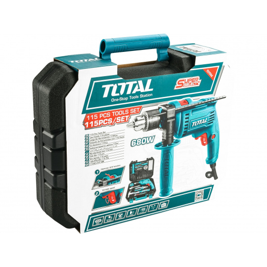 Vrtačka s příklepem a nářadím, 680W, 115ks