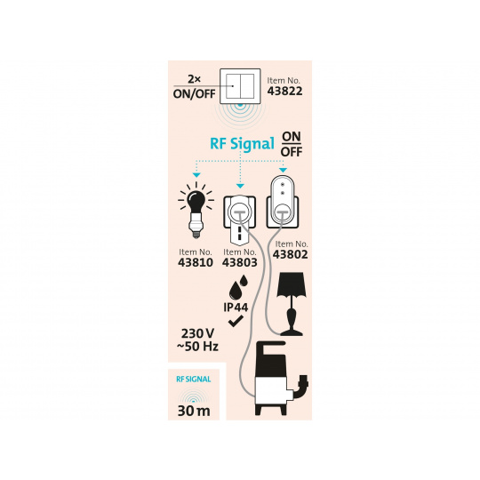 funkce: vypnout/zapnout, možnost spárovat každý kanál s více zařízeními, trvalá paměť, 433,92MHz, 12V 23A baterie (součást balení)
