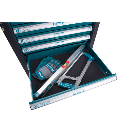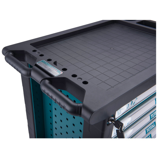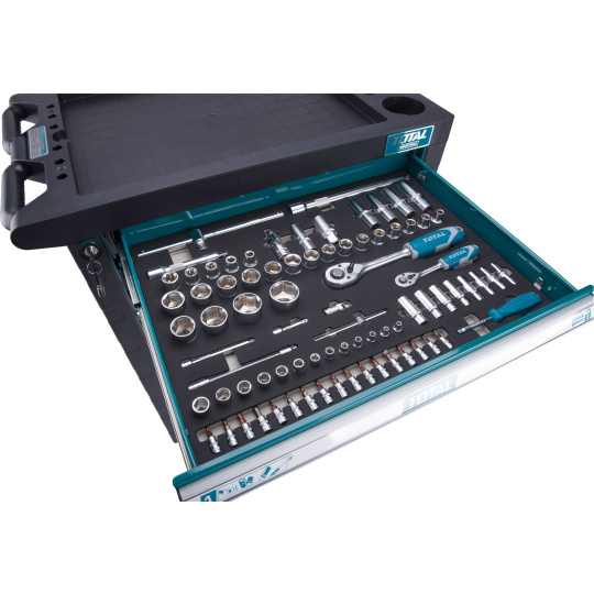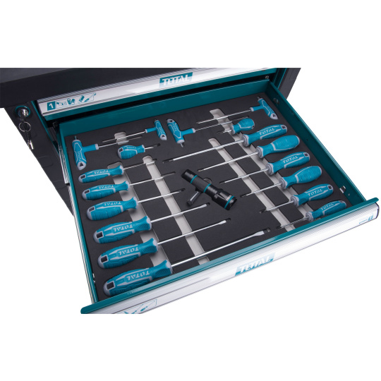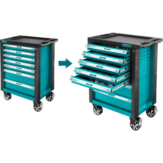 Dílenský vozík obsahuje vysoce kvalitní nářadí z CrV oceli a dalších lepších slitin. Vozík obsahuje 7 šuplíků a má rozměry 765x465x812mm. Rozměry horních 5 šuplíků jsou 536x410x74,5mm. Spodní dva šuplíky jsou hlubší s rozměrem 536x410x153,5mm. Vozík je uzamykatelný jedním klíčem. Je vybaven brzdami na obě dvě zadní transportní kolečka. Pojezdy zásuvek s kulovými ložisky jsou vybaveny zarážkou proti celkovému výsuvu. Pro snadnou manipulaci je vozík nahoře vybaven úchopy pro ruce.